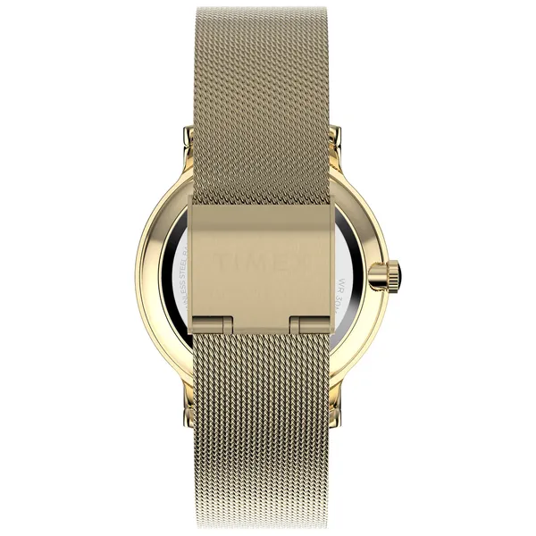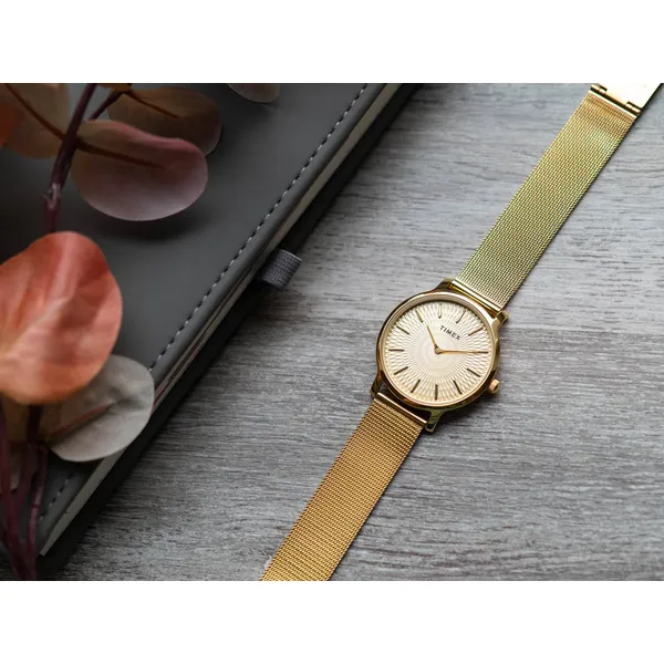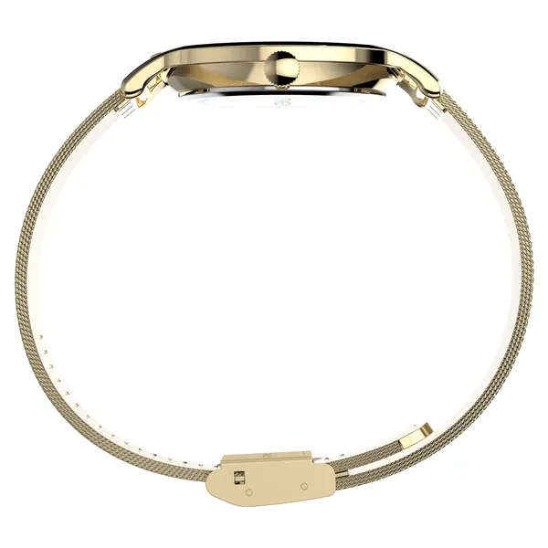 Az ikonikus Timex Transcend női karóra letisztult arany színével bármilyen alkalomra stílusos választás. A mindössze 6 mm vékony, 34 mm-es nemesacél tokban megbízható kvarc szerkezet ketyeg, amelyet karcálló ásványi üveg véd. A fényes nemesacél karkötő elegánsan simul a csuklóra, legfeljebb 19 cm kerületig.