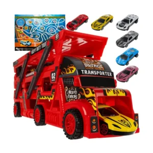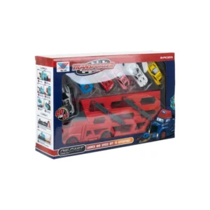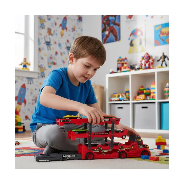 Valósághű TIR kamion szett beépített autókilövővel és 6 részletes kisautóval: egy gombnyomás, és indulhat a verseny. A 3 szintes tréler egyszerre teszi izgalmassá a szállítmányozós szerepjátékot és segít rendben tárolni az autókat játék után.