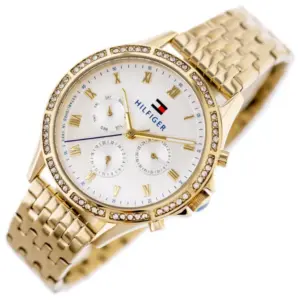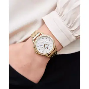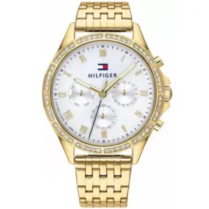A Tommy Hilfiger 1782142 Ari elegáns női karóra, amelyet megbízható kvarc szerkezet működtet. A tok és a szíj rozsdamentes acélból készült, így tartós és kényelmes viselet a mindennapokban. A megjelenést az ezüst színű, jól leolvasható számlap teszi teljessé, amelyet arany színű római számok és indexek díszítenek.
