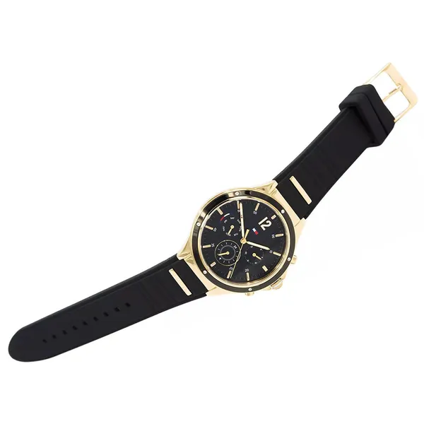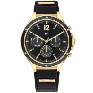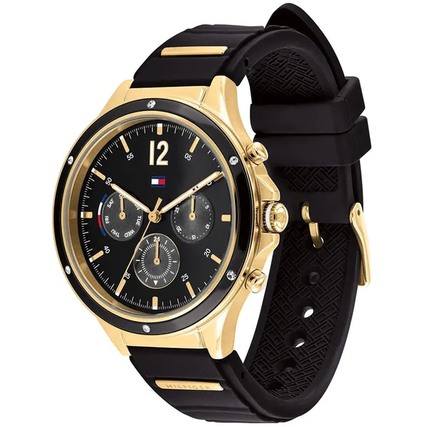 A Tommy Hilfiger Eve 1782282 női karóra elegáns és sokoldalú választás a mindennapokra és alkalmi viselethez is. Az aranyszínű, rozsdamentes acél tokot fekete díszítőgyűrű egészíti ki, amely modern megjelenést ad az órának. A fekete számlapon aranyszínű jelölések és praktikus segédszámlapok kaptak helyet, míg a kényelmes fekete szilikon szíj stabil és kellemes viseletet biztosít.