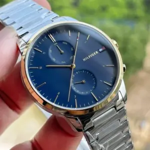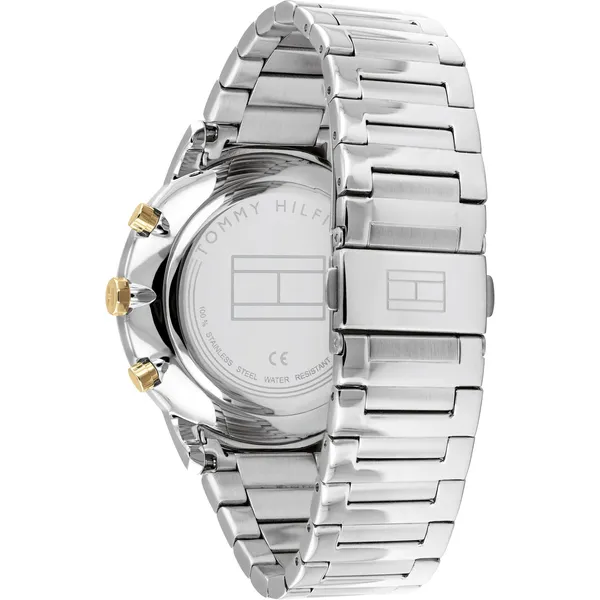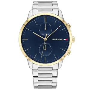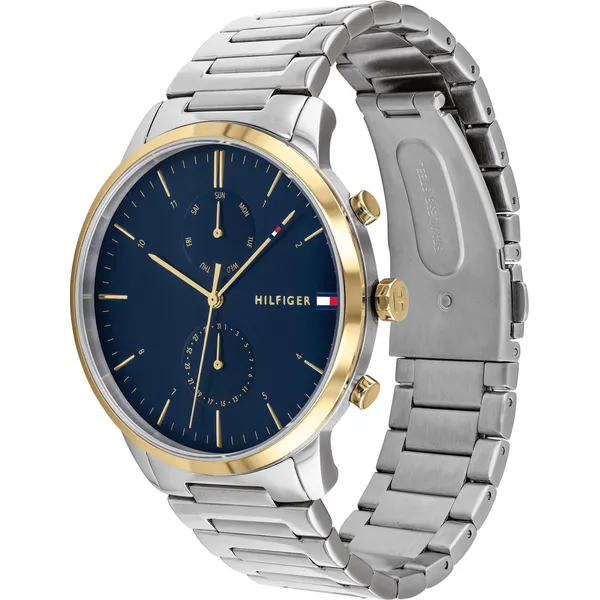 A Tommy Hilfiger Hunter 1710408 férfi karóra elegáns, mégis mindennap jól viselhető modell. Az elemes kvarc szerkezet megbízható működést biztosít, míg a kerek, arany- és ezüstszínű rozsdamentes acél tok és a ezüstszínű acélcsat kifinomult megjelenést ad. A sötétkék számlapon elhelyezett mutatók és indexek jól leolvashatók, a kisebb segédszámlapok pedig praktikus információkat jelenítenek meg.
