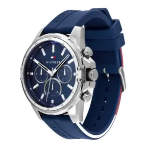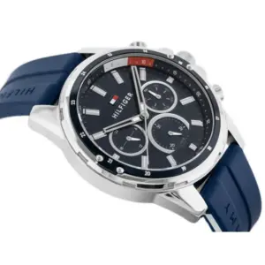 A Tommy Hilfiger 1791791 férfi karóra elegáns és sportos megjelenést kínál egyetlen modellben. A kék számlap, a kerek tokforma és a kék gumiszíj modern, könnyen viselhető összhatást ad, így a karóra jól illik hétköznapi és alkalmi öltözékhez is.