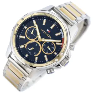 A Tommy Hilfiger 1791937 férfi karóra divatos, lezser stílusú modell, amely könnyen illeszkedik a hétköznapi és az elegánsabb megjelenéshez is. Az ezüst- és aranyszínű rozsdamentes acél tok és szíj tartós, korrózióálló kialakítást biztosít, míg a sötétkék számlapot ásványi üveg védi a mindennapi használat során fellépő karcoktól és kisebb ütődésektől.