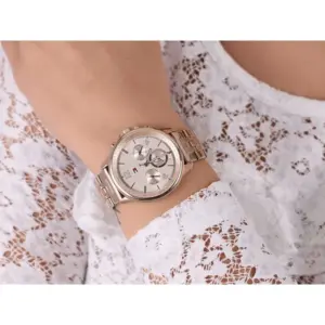 Elegáns, rozéarany megjelenésével stílusos kiegészítő a mindennapokra, miközben a rozsdamentes acél kivitel tartós viseletet biztosít. A nap- és dátumkijelzés, valamint a 24 órás kijelző praktikusabbá teszi a használatát.