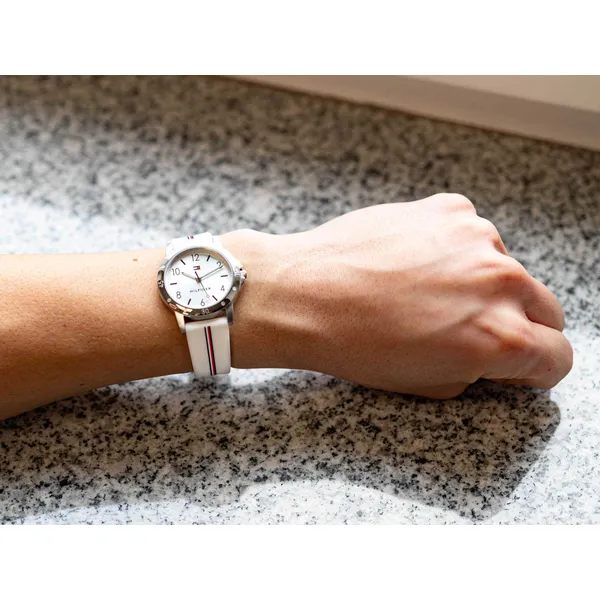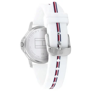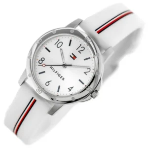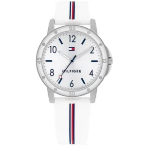 A Tommy Hilfiger Kids 1720014 egy időtálló, stílusos gyerek karóra, amely tökéletes választás a mindennapokra és ajándéknak is. A ezüstszínű nemesacél tok és a fehér szíj letisztult, prémium megjelenést ad, miközben a strapabíró kialakítás a gyerekek aktív életmódjához igazodik.