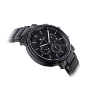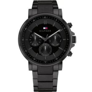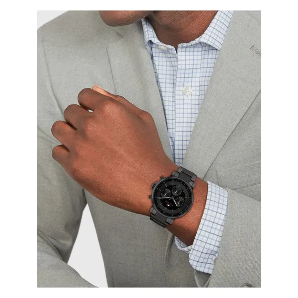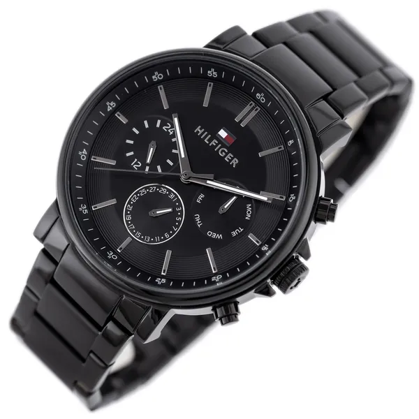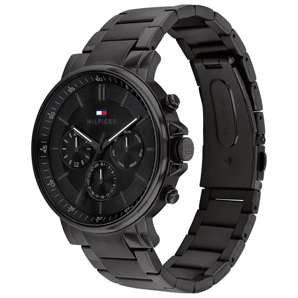 A Tommy Hilfiger Tyson 1710590 férfi karóra a fekete PVD bevonatú 316L rozsdamentes acél tokot és az elegáns aranyszínű részleteket ötvözi. A napfény-mintás fekete számlapon külön segédszámlák mutatják a dátumot, a hét napját és a 24 órás időformátumot, miközben a precíz kvarc szerkezet gondoskodik a pontos időről. A karcálló ásványi üveg és az 5 ATM vízállóság megbízható védelmet nyújt a mindennapi viselés során.