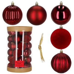 Teremts egységes, gazdag hatású karácsonyi dekorációt 36 darab, piros árnyalatú gömbbel. A törhetetlen kivitel nyugodtabb ünnepi készülődést ad, a fényes, félmatt és bársonyos felületek pedig látványosan kiemelik a fát; az akasztó zsinórok a csomagban vannak.