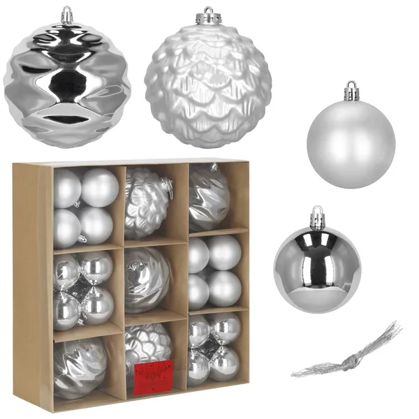 Törhetetlen karácsonyfadísz gömb szett, 37 db, ezüst & gyöngyház, műanyag