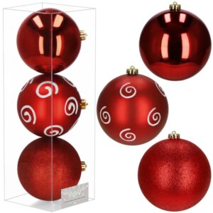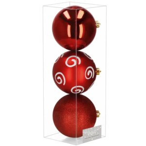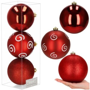 A 3 darabos, 15 cm-es piros-fehér karácsonyi gömbszett törhetetlen műanyagból készül, így kicsik és házi kedvencek mellett is biztonságos. Háromféle felületkezelése és a mellékelt akasztók látványos, gyors dekorálást tesznek lehetővé.