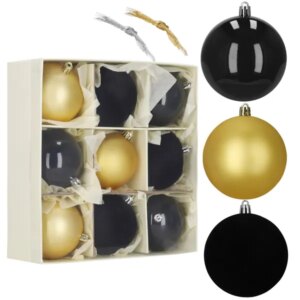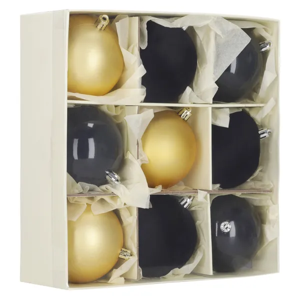 Az elegáns fekete–arany–grafit palettán érkező, 8 cm-es törhetetlen gömbdíszekkel biztonságosan teheti ragyogóvá karácsonyfáját; a 9 darabos készlethez akasztózsinórt is adunk, így azonnal kezdődhet a dekorálás.