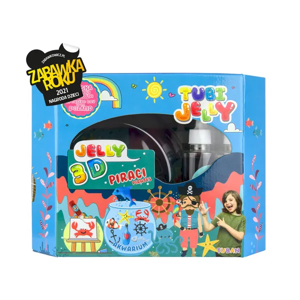 A Tubi Jelly Kalóz tematikájú 3D kreatív készletben látványos, zseléállagú figurákat készíthetsz, majd egy nagy akváriumban életre keltheted őket vízkristályok között. A színes gélek és a sablonok segítségével a folyadékból pár perc alatt térbeli figura lesz – izgalmas kísérletezés és alkotás egyben.
