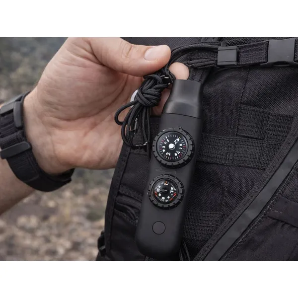 Egyetlen kompakt eszközben kapsz vészsípot, iránytűt, LED lámpát, nagyítót és hőmérőt, így túrán vagy kempingben gyorsabban tudsz tájékozódni és jelezni. Zsinórral a nyakadba akasztható vagy a hátizsákra rögzíthető, hogy mindig kéznél legyen.