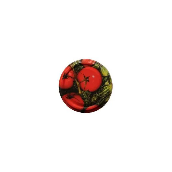 Gazdaságos, 82 mm-es twist-off fedél 6-pontos zárással és dekoratív paradicsom mintával, amely megbízható vákuumot és látványos kamrapolcot kínál nagytételben.