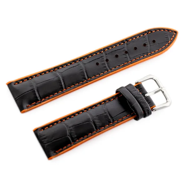 Fekete-narancs színű gumírozott óraszíj bőr felsőrésszel, narancssárga cérnával varrva.