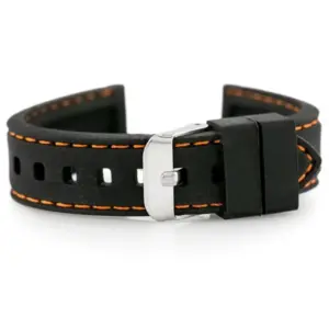 Tartós gumióraszíj kényelmes viselettel, amely jól bírja a mindennapi használatot és sportos megjelenést ad az órának. A fekete szín és a narancssárga varrás feltűnő, mégis könnyen kombinálható stílust kínál.