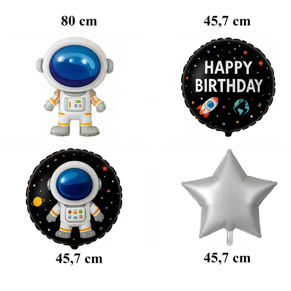 • Összesen 5 db tartós alumínium-fólia lufi: 1×űrhajós, 4×csillag.