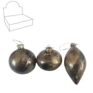 Elegáns, fekete–arany márványmintájú üvegdísz páros, amely gömb (8 cm) és karcsú csepp (12,8 cm) formájával azonnal luxust és ragyogást visz a karácsonyfára, tartós prémium üvegének köszönhetően évről évre újra felhasználható.
