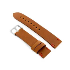 Valódi, finom tapintású barna bőr óraszíj, amelyet kontrasztos piros varrás és ezüstszínű csat tesz egyedivé. Klasszikus kinézete mellett tartós és kényelmes viseletet biztosít mindennapi használatra vagy elegáns alkalmakra egyaránt.