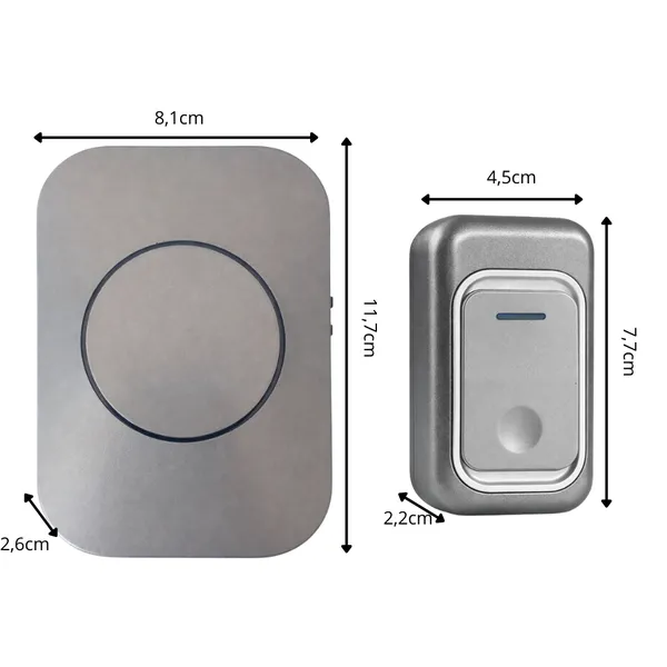 • Méretek: nyomógomb 7,7 × 4,5 × 2,2 cm; vevőegység 11,7 × 8,1 × 2,6 cm