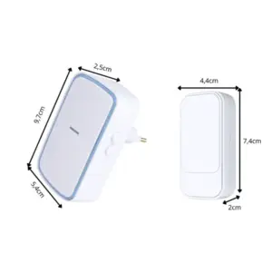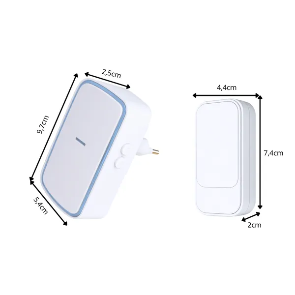 • Méretek: nyomógomb 7,4 × 4,4 × 2 cm; vevő 9,7 × 5,4 × 2,5 cm