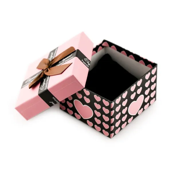 Elegáns, szív alakú karton díszdoboz világos rózsaszín és fekete színben, barna szalaggal díszítve. Kiváló választás karóra esztétikus és alkalomhoz illő átadásához.