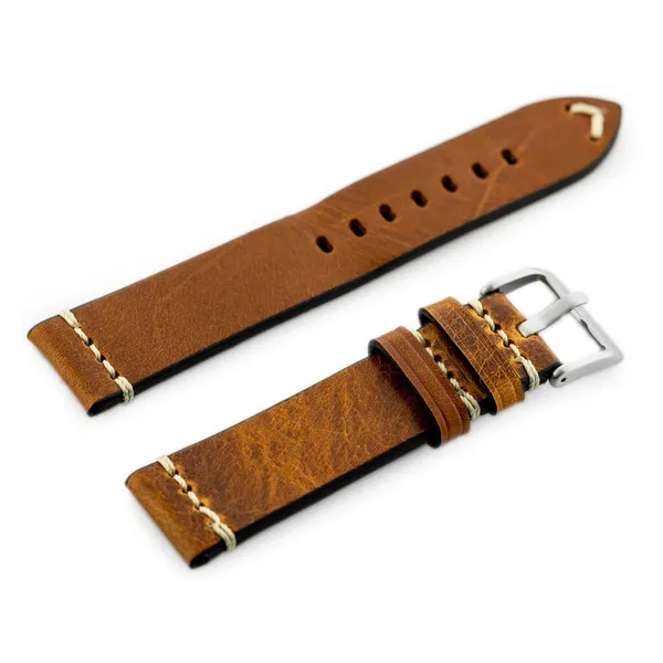 Világosbarna valódi bőr óraszíj fehér varrással, 24 mm
