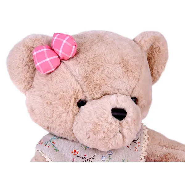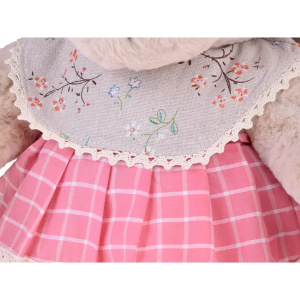 A 58 cm magas, bézs bundájú vintage plüss maci rózsaszín kockás ruhájával pillanatok alatt a család kedvence lesz. Extra puha tapintása és gondosan kidolgozott részletei miatt ideális alvótárs, dekoráció vagy különleges ajándék minden korosztálynak.