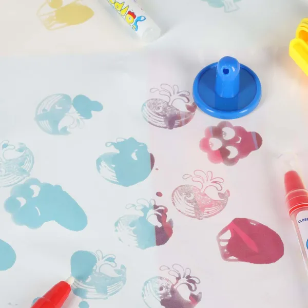 • Gazdag készlet: 3 víztoll, 3 bélyegző, nyomdapárna, mintás henger, 3 sablon és lépésről-lépésre füzet a még több mókáért.
