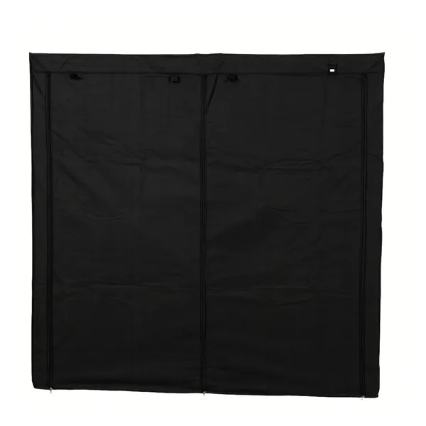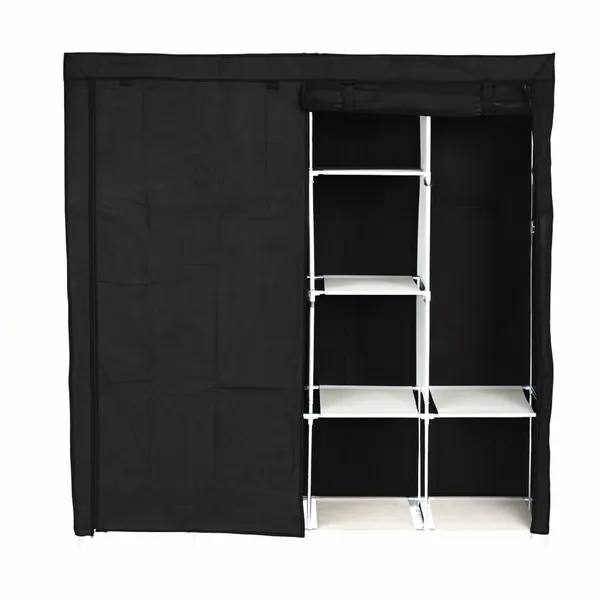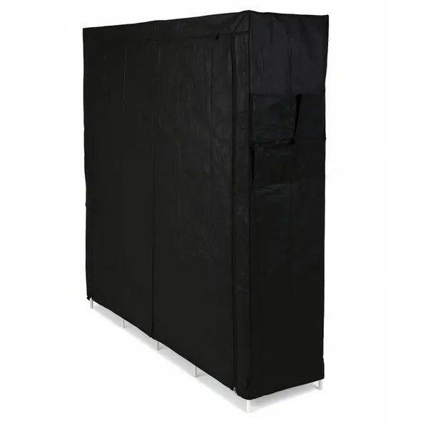 Nagy méretű, fekete textil ruhásszekrény praktikus és könnyű tárolómegoldás hálószobába, gardróbba, irodába vagy gyerekszobába. A stabil, fém csövekből álló váz és a tartós külső huzat segít megóvni a ruhákat a portól, miközben a jól átgondolt belső elrendezésnek köszönhetően mindennek könnyen megtalálod a helyét.