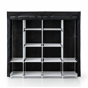 XXL textil ruhásszekrény fekete, 12 polccal és 2 akasztórúddal
