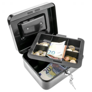 A zárható, masszív fém pénzkazetta megbízható megoldás készpénz, érmék, bankjegyek és fontos iratok biztonságos tárolására otthon, irodában vagy üzletben. A belső, rekeszekre osztott érmetartóval gyorsan és átláthatóan rendszerezheti a bilont.