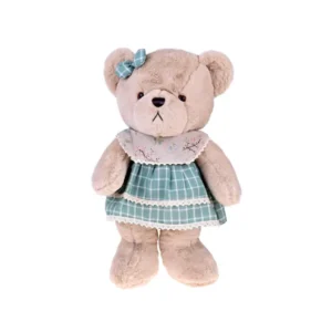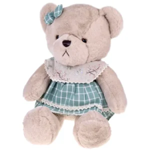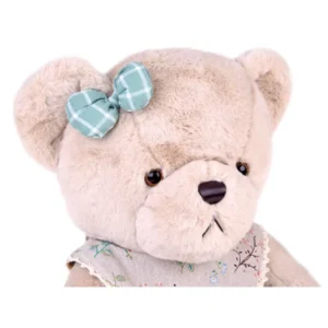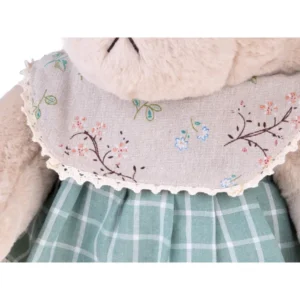 A puha, selymes tapintású plüssszőrbe az első érintéskor beleszeretsz, a semleges arckifejezés pedig teret ad a gyermeki képzeletnek. A zöld-fehér kockás, csipkével szegélyezett ruha és a hozzá illő masni egyaránt levehető, így könnyen mosható, vasalható és variálható.