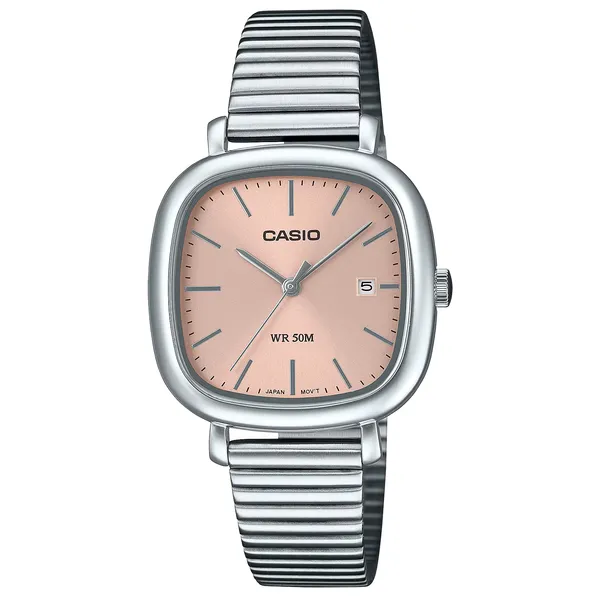 • Casio női кварc karóra, ezüst acél szíjjal, rózsaszín számlappal, WR50