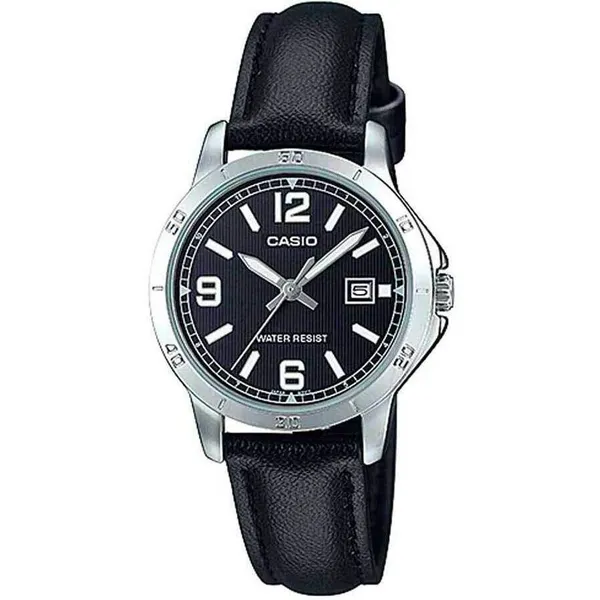 • Casio női кварc karóra fekete bőrszíjjal, fekete számlappal, WR30