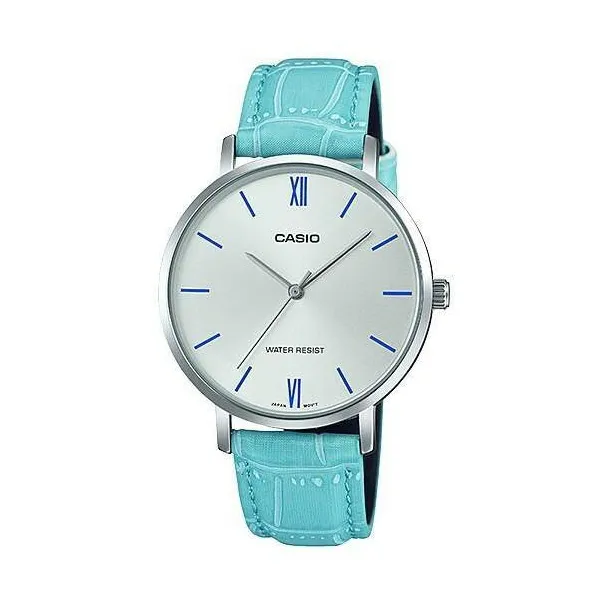 • Casio női кварц karóra 34 mm, ezüst számlap, türkiz bőrszíj, WR30