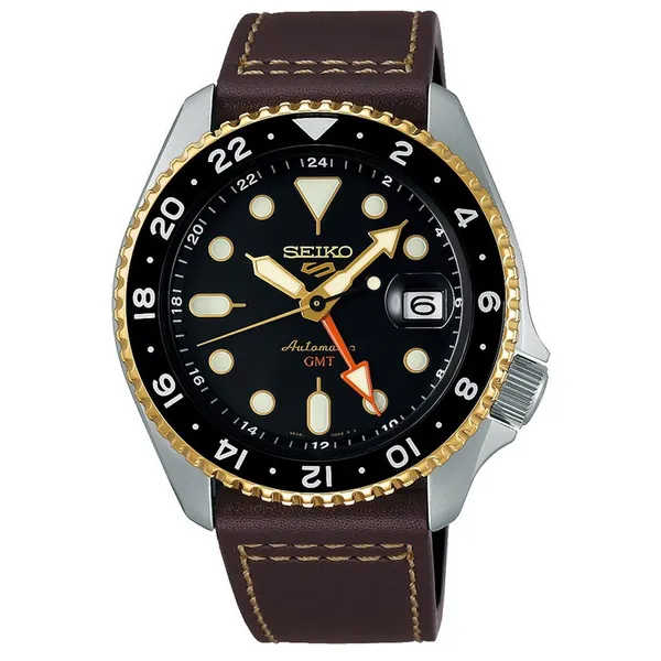 • Seiko 5 Sports GMT férfi automata óra SSK036K1, fekete számlap, barna bőr szíj, 100 m