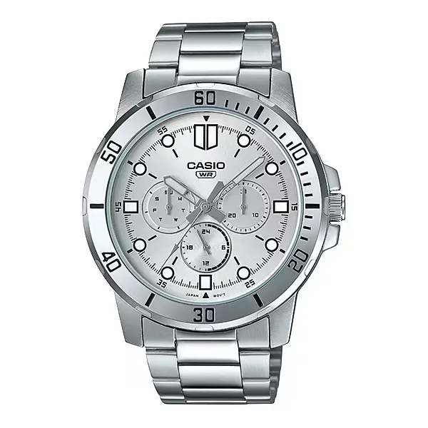 • Casio férfi karóra MTP-VD300D-7E, ezüst acél, kvarc, dátum, WR30