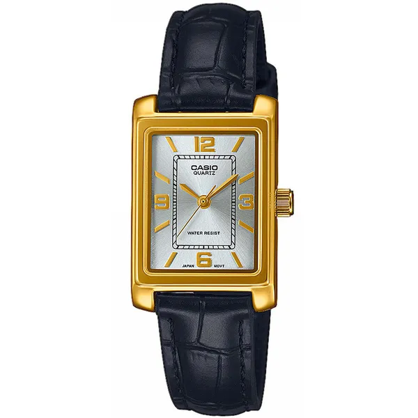 • Casio női кварц óra, arany szögletes tok, fekete bőrszíj, WR30