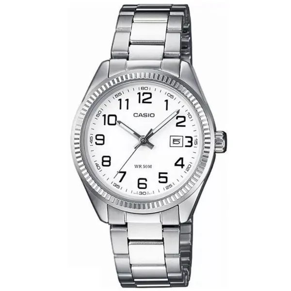 • Casio női karóra, ezüst acél csat, fehér számlap, dátum, WR30